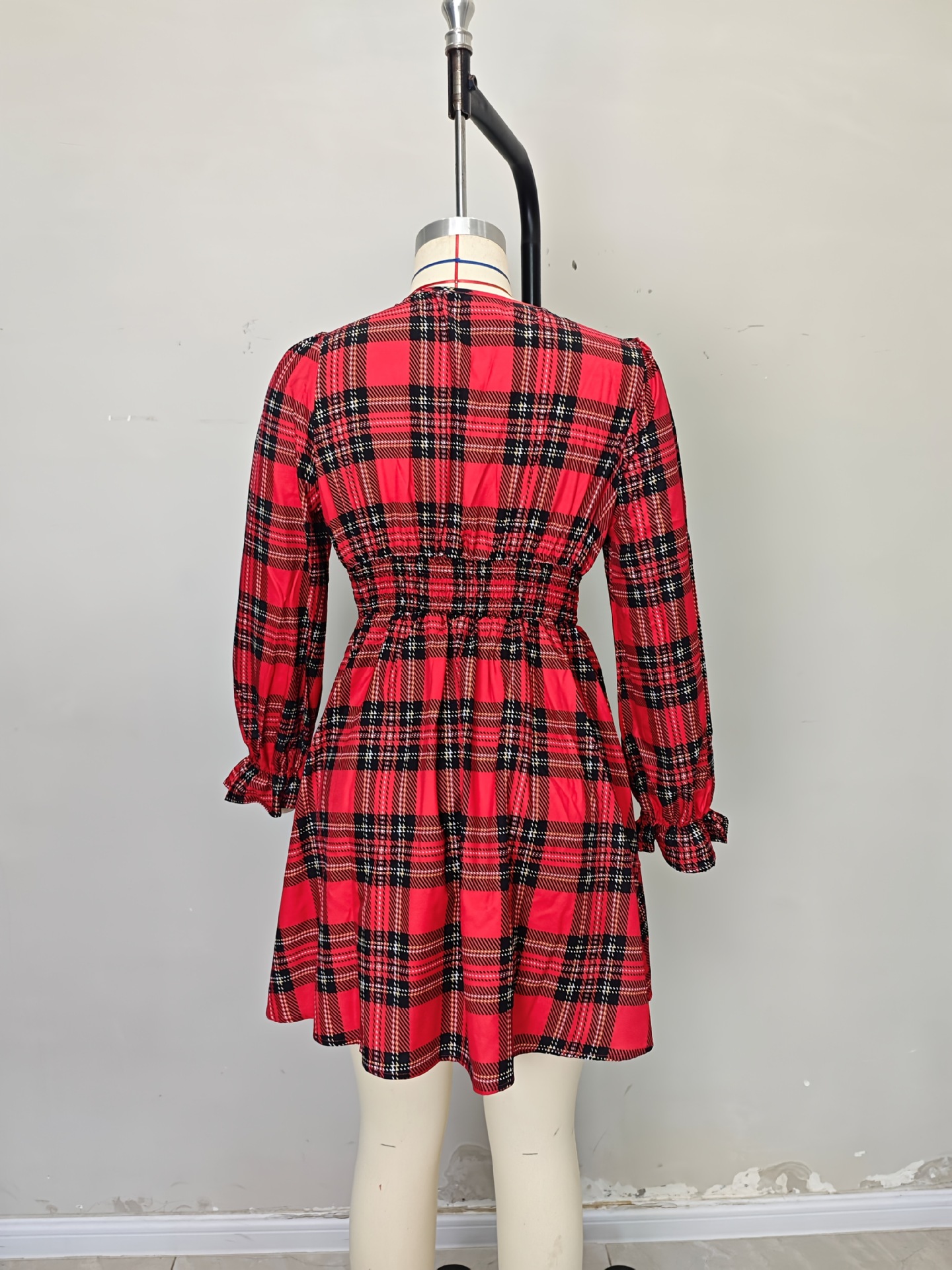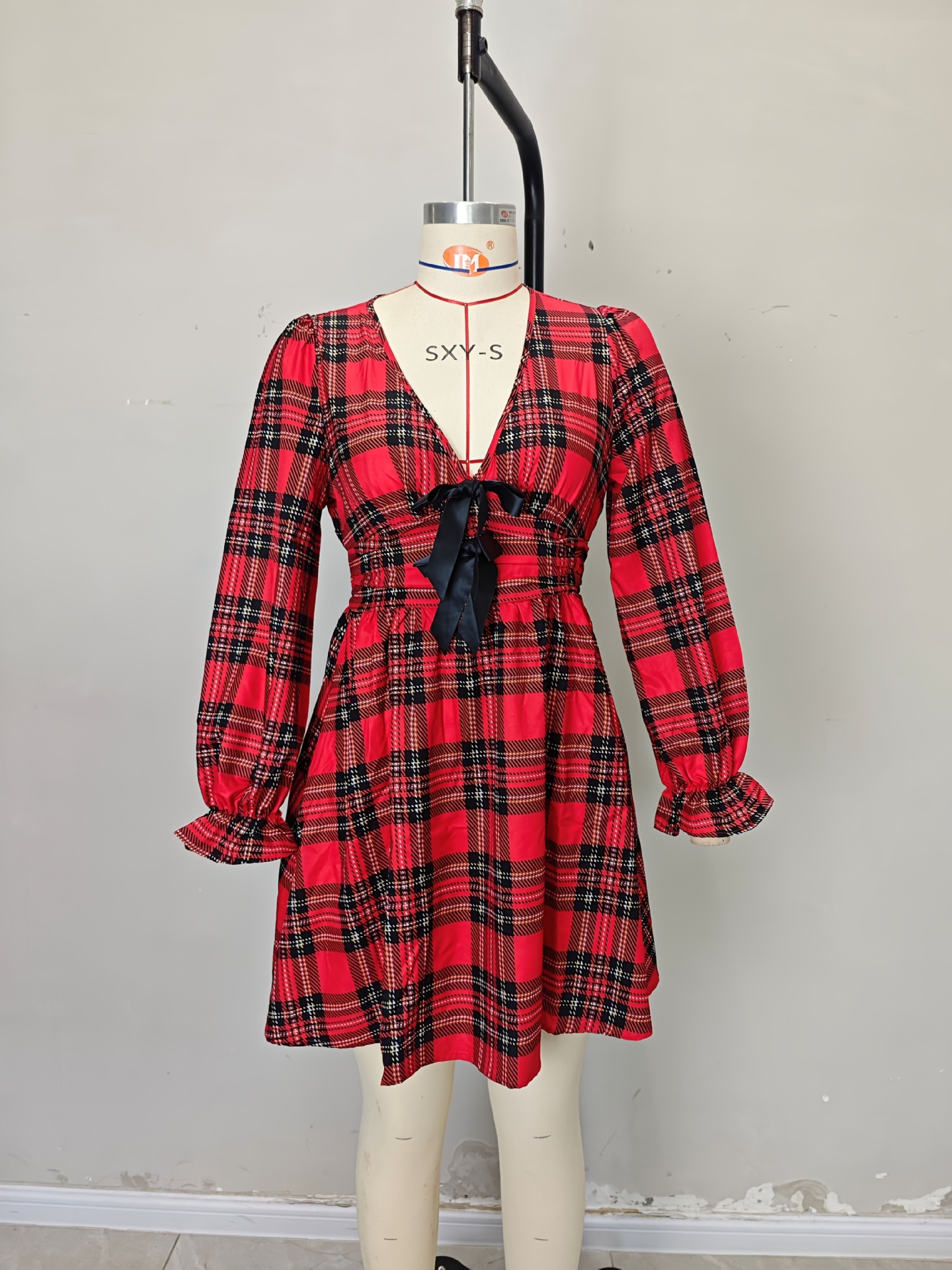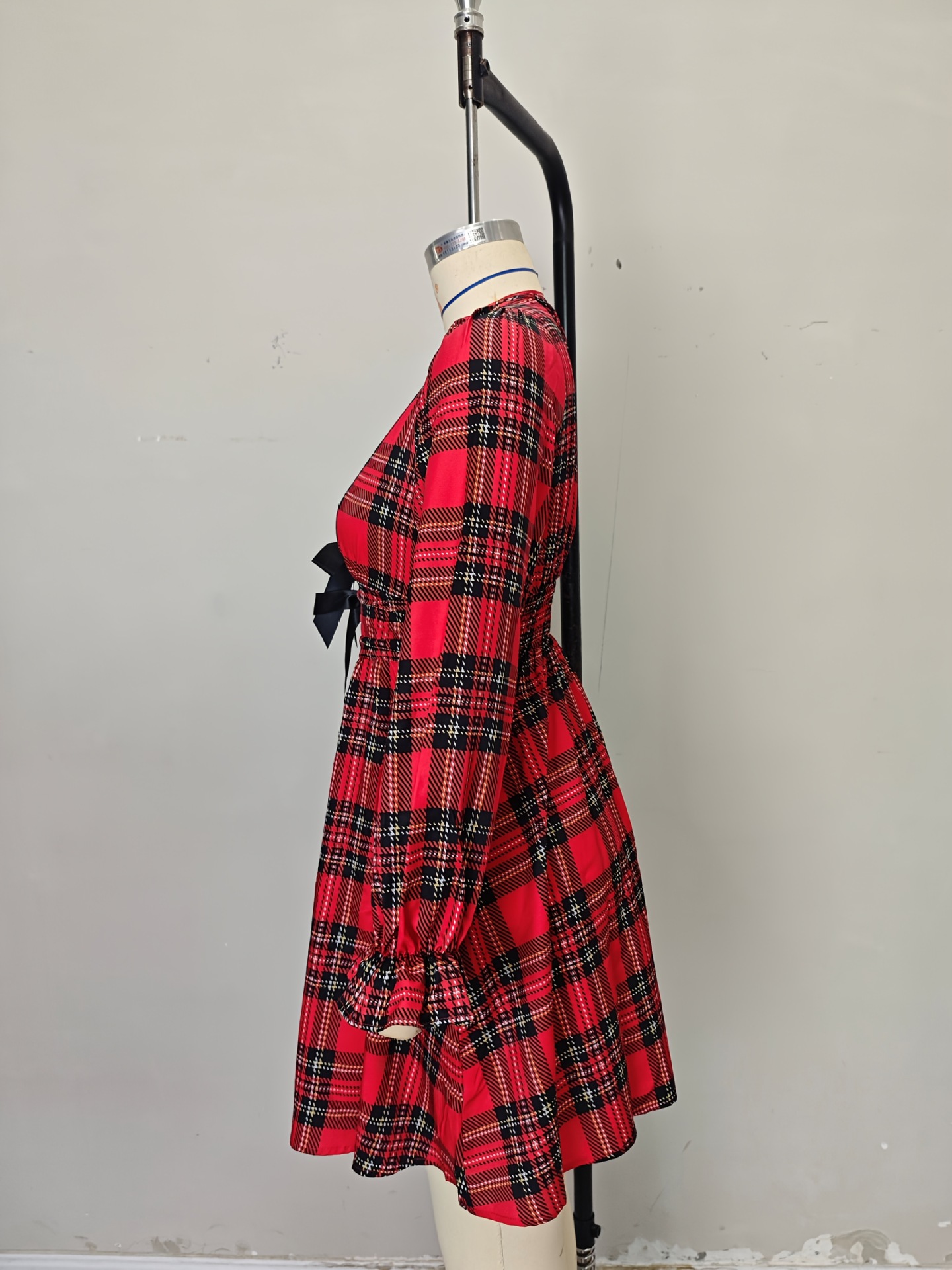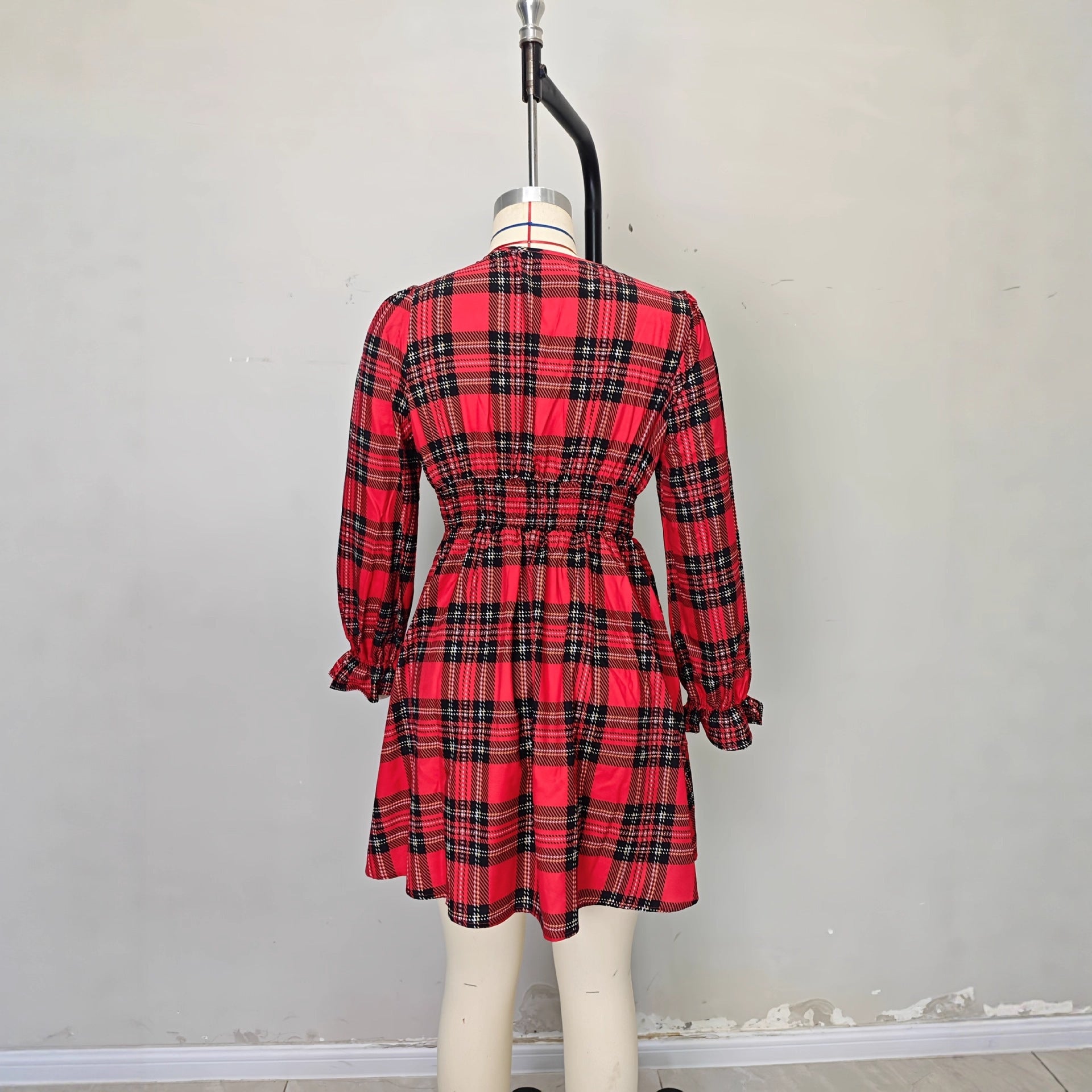 Robe Noël Lumière™ – Col V & Manches Lanternes à Motif Carreaux